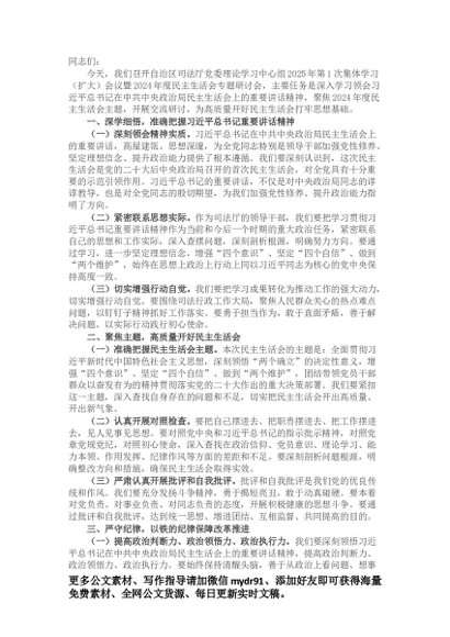 / 党委书记在司法厅党委理论学习中心组2025年第1次集体学习(扩大)会议暨2024年度民主生活会专题研讨会上的发言材料