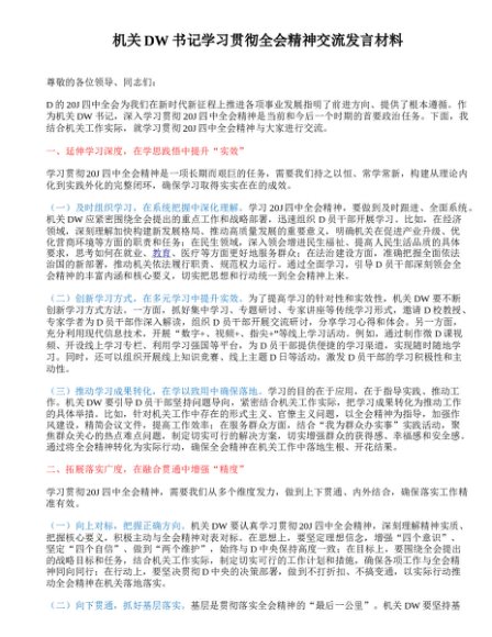 机关DW书记学习贯彻全会精神交流发言材料